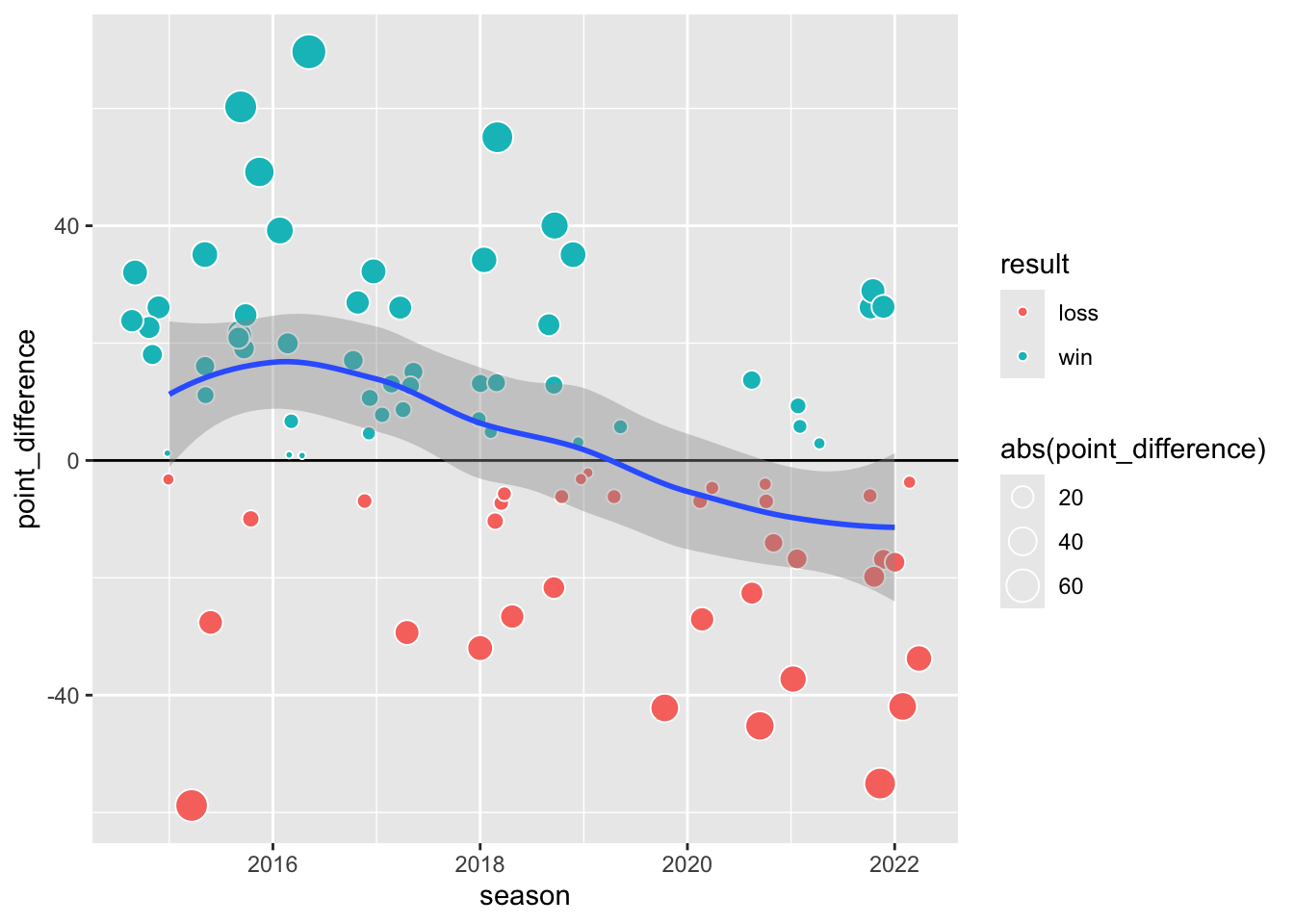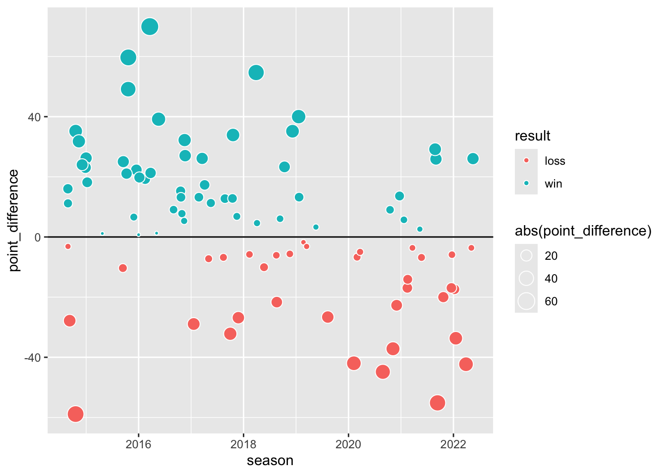 abs()function here stands for “absolute value.” It allows dots to grow when the point difference is further from zero, using smaller dots to indicate when a game was particularly close.