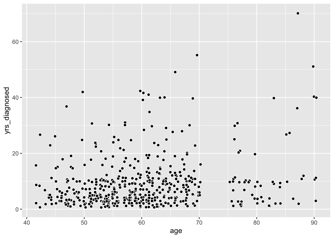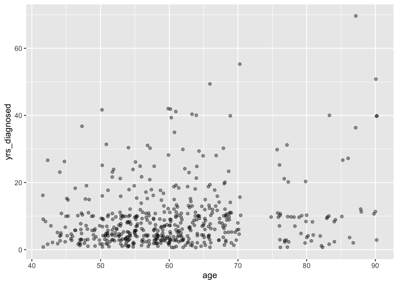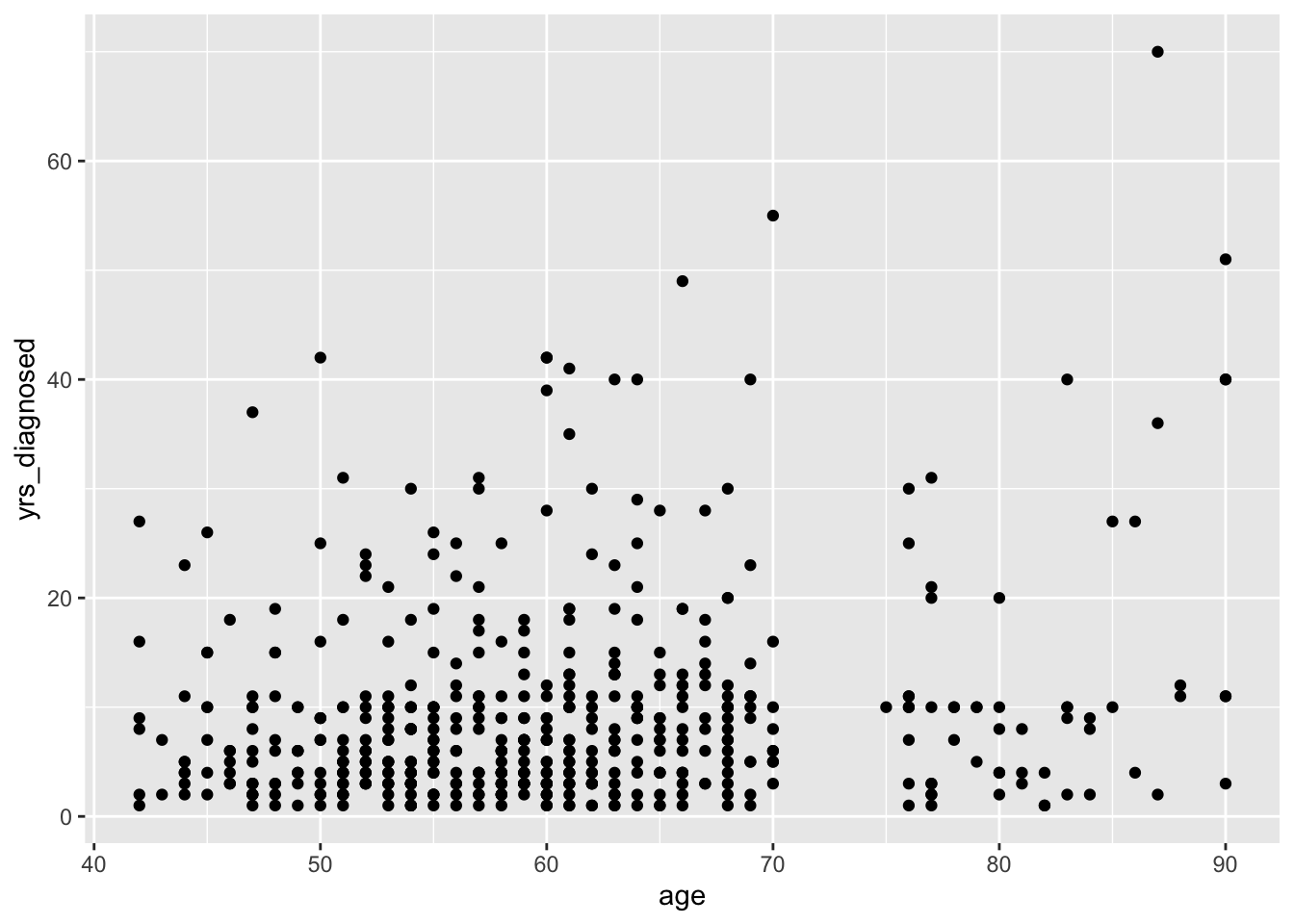 Scatter plots allow us to show associations among two or more quantitative variables. For instance, we might wonder whether older patients have passed more years since their arthritis diagnosis, and we can easily show this association: