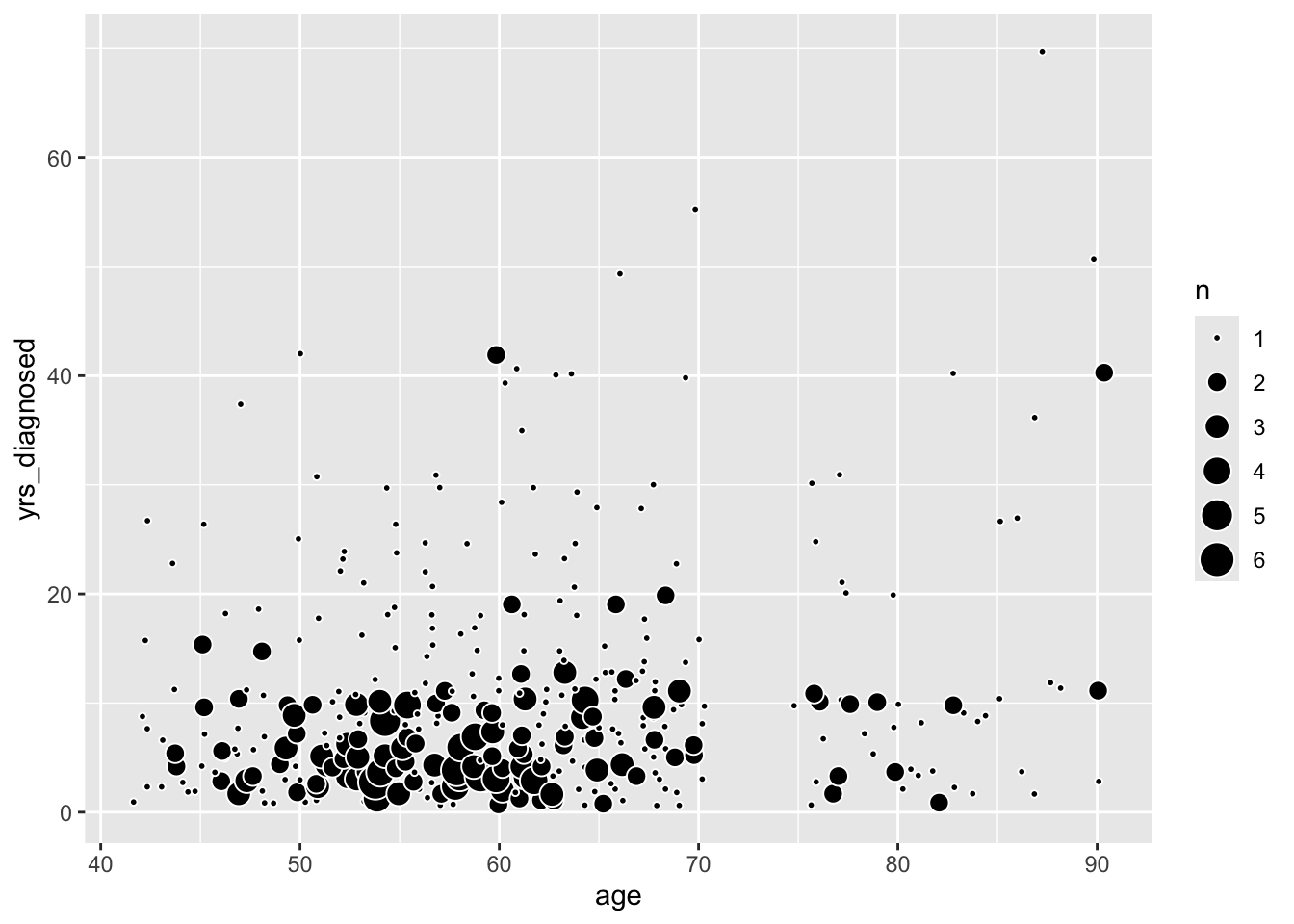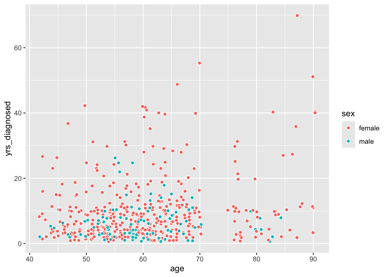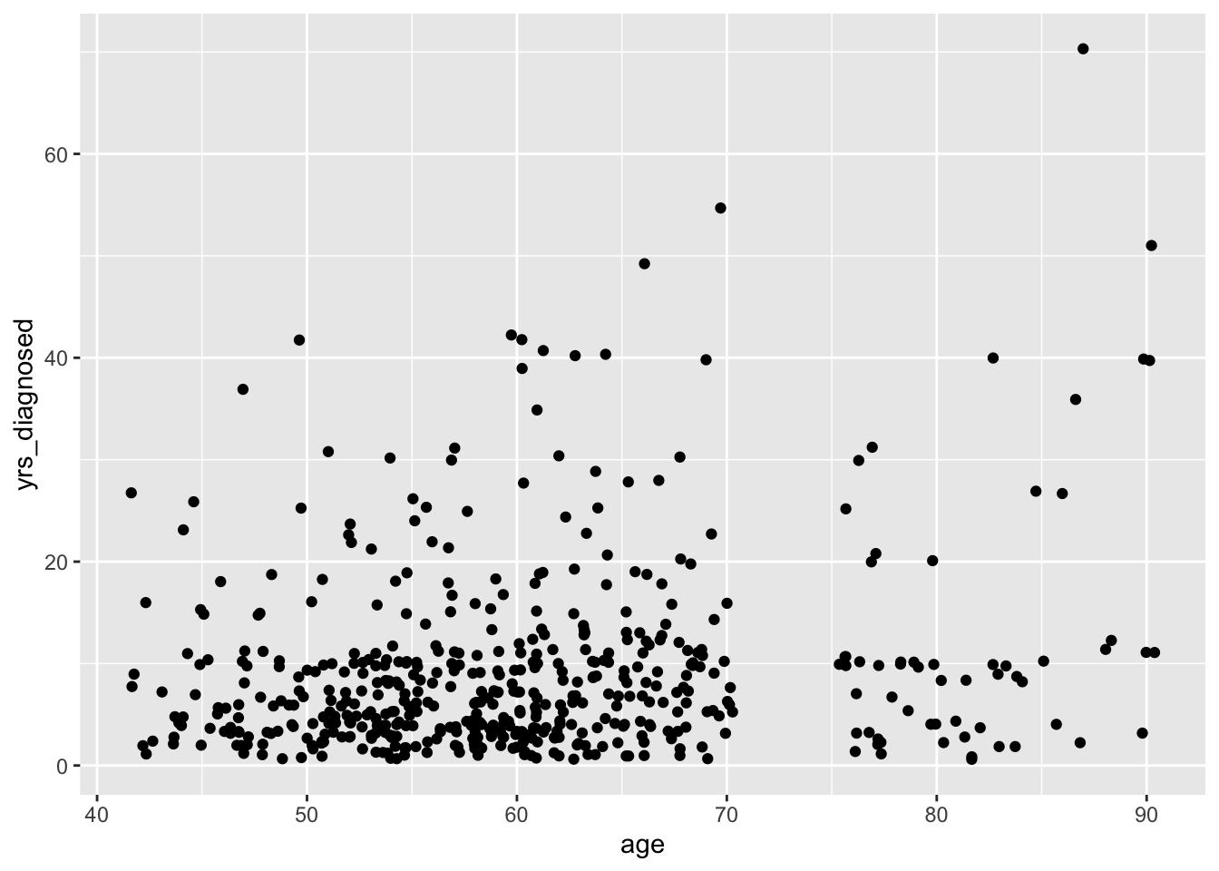 Scatter plots allow us to show associations among two or more quantitative variables. For instance, we might wonder whether older patients have passed more years since their arthritis diagnosis, and we can easily show this association: