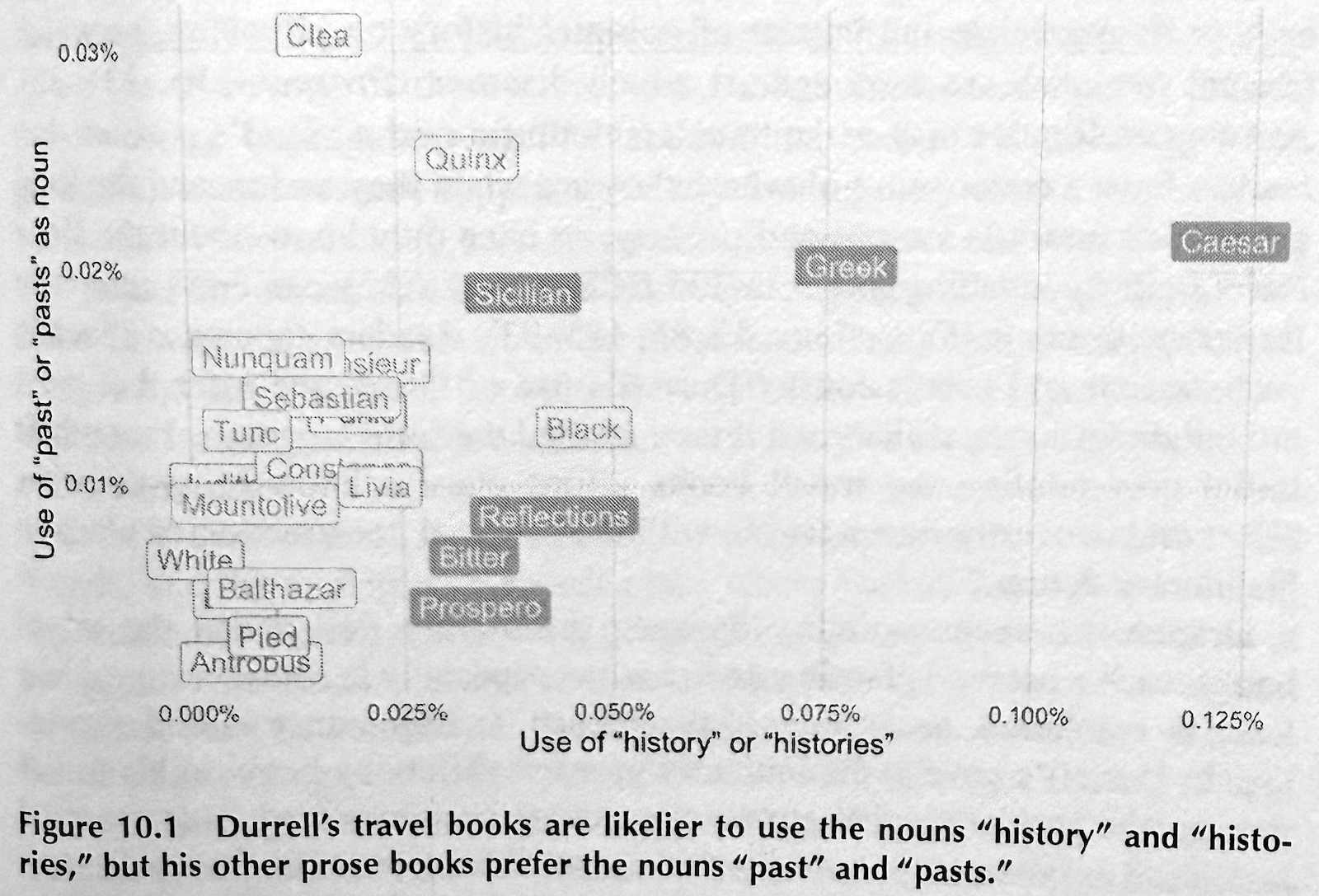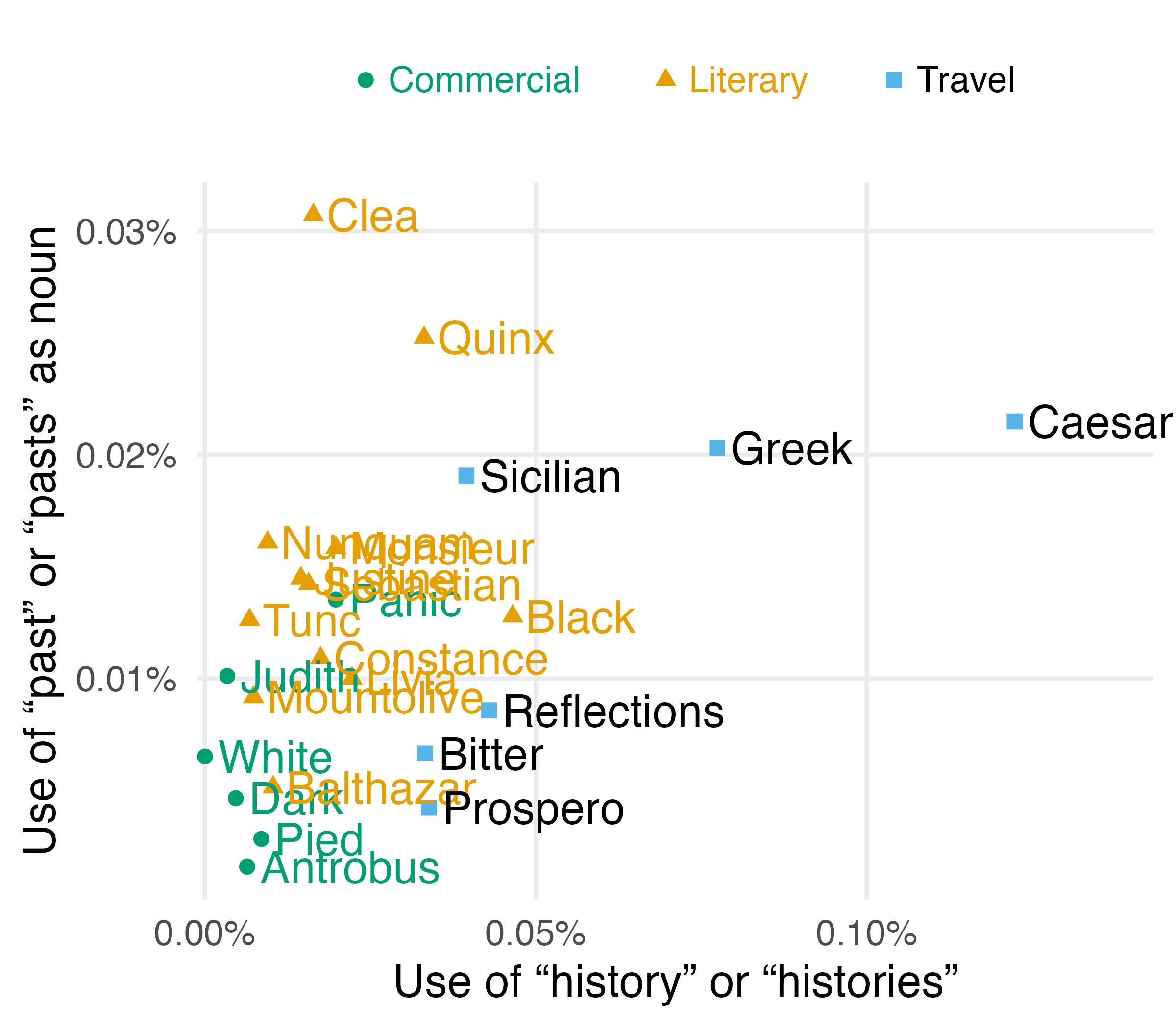 Each version shows a comparison between three genres of Durrell’s prose: his travel writing (the main focus of my study), his literary fiction, and his commercial fiction. Comparing word frequencies on two axis, the figure demonstrates the possibly unsurprising relationship of genre to word choice. Travel writing is more likely to engage with the past by using the nouns “history” or “histories” to describe a shared, public timeline—historical buildings, infrastructures, regimes, and so on. Meanwhile, Durrell’s literary fiction relies more on the nouns “past” or “pasts” to describe an individualistic, personal experience of recently lived time. With notable exceptions, his commercial fiction is less likely to engage with either.