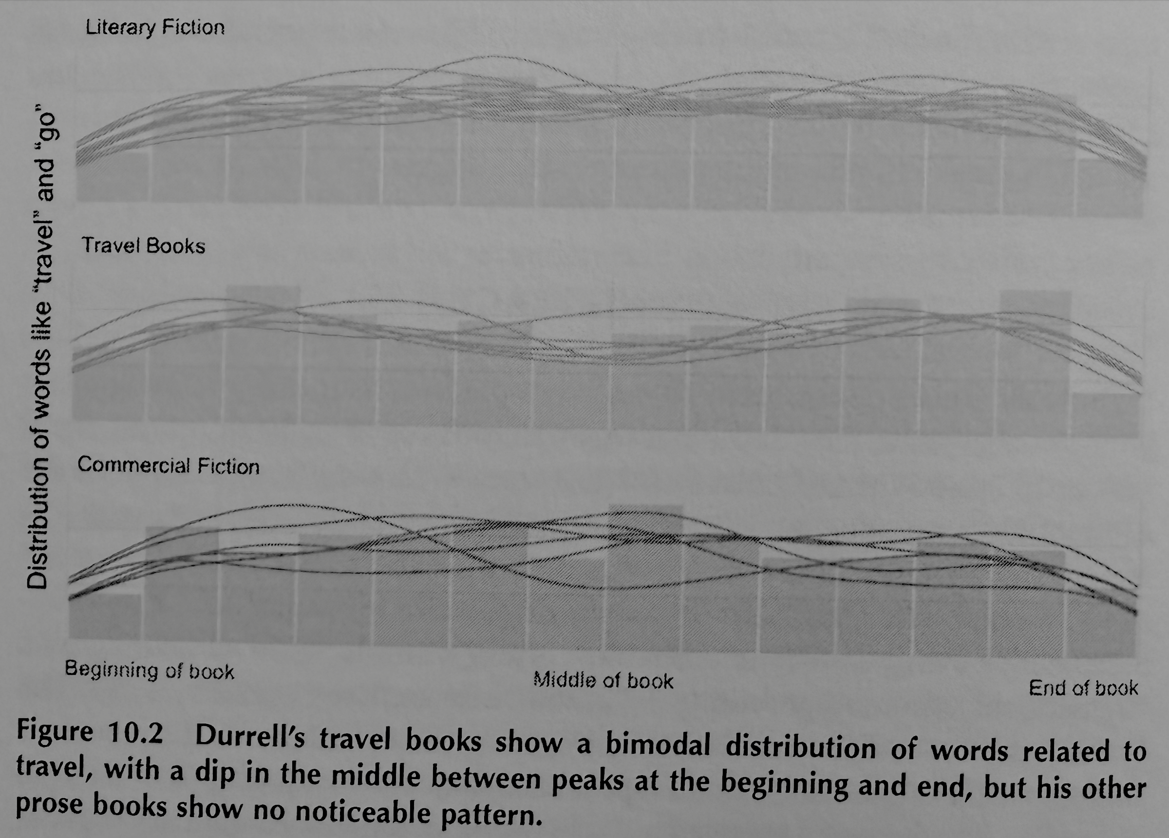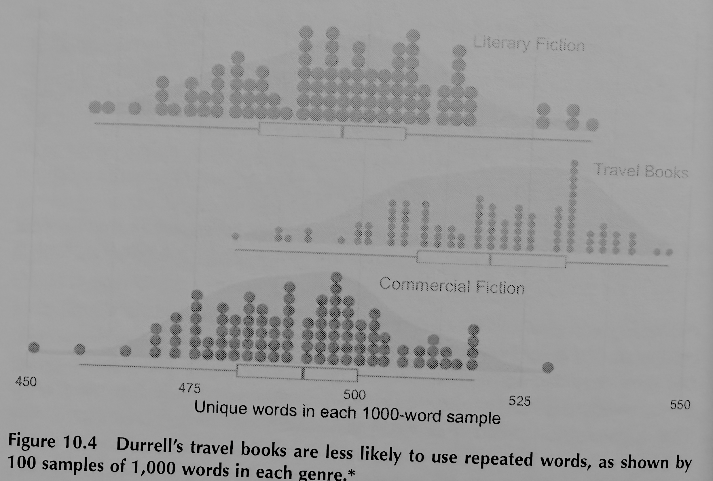 Despite Steiner’s and Kelly’s emphasis on precision and rarity of vocabulary in the literary novels, this process shows that Durrell’s travel books tend to have greater lexical diversity than his literary and commercial fiction. They use more words. Obviously, genres in this visualization show some overlap in their distributions. The figure even shows about half of the samples in the travel books seeming as if they could belong to the piles from either genre of fiction. But the other half of samples in the travel writing share diversity measures with the fiction more rarely, and the data suggest that the genres are truly different.