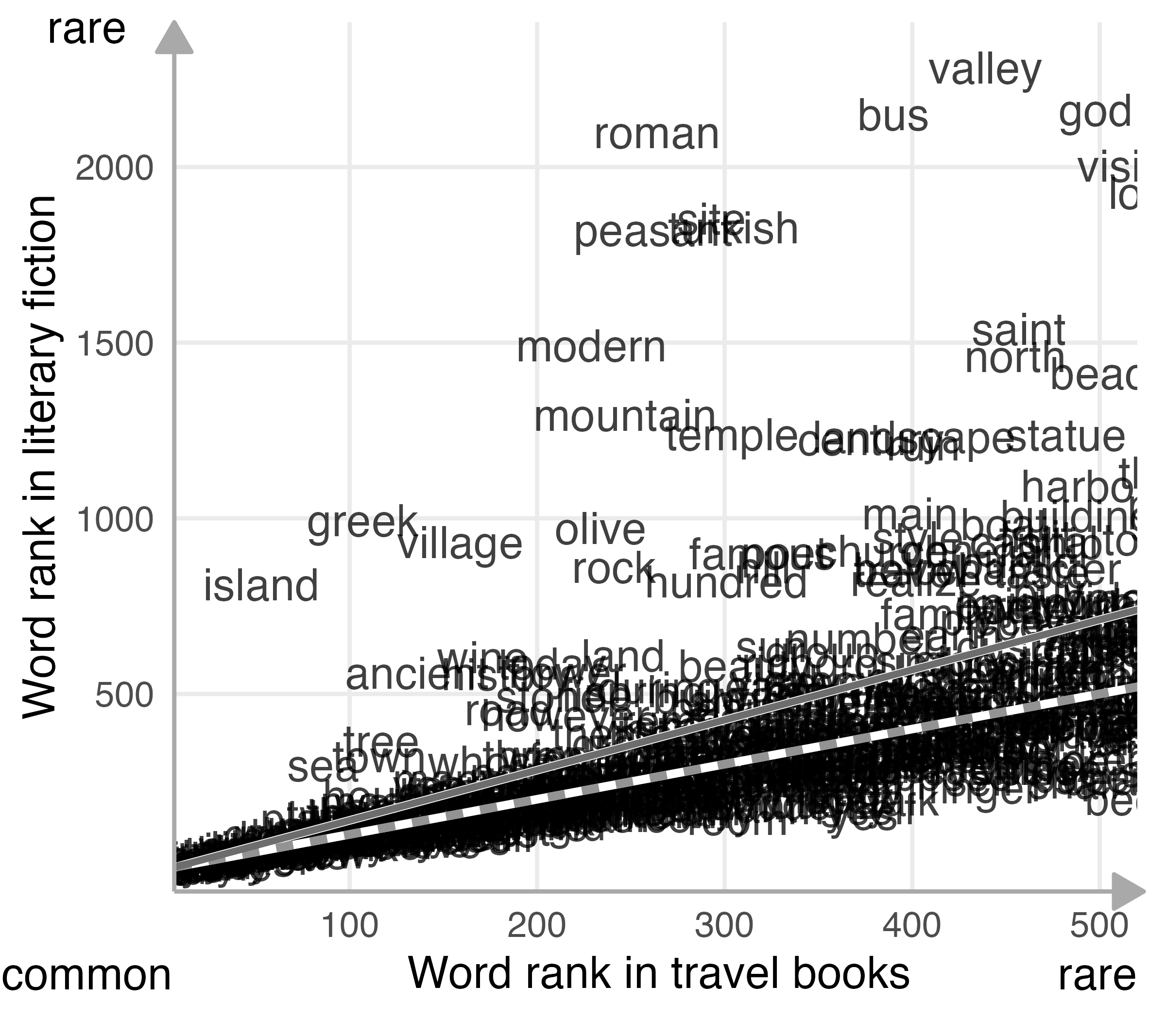 Since the travel books and the literary fiction more readily engage with some idea of the past, figure three looks more closely at all the words they use. Words are ranked by how commonly they’re used in each group of books before being placed horizontally by their rareness in travel books and vertically by their rareness in Durrell’s literary fiction. Most words are overprinted in an undifferentiated mass—but some rise above, demonstrating words that are more common in travel writing than in the literary fiction. Trend lines show projected relationships of word rankings between the two genres: the solid line shows the actual relationship, where words that are pretty common in the travel books seem to be used more rarely in the novels; the dashed line shows an imagined relationship for comparison, showing how things would look if words were ranked equally in both genres.