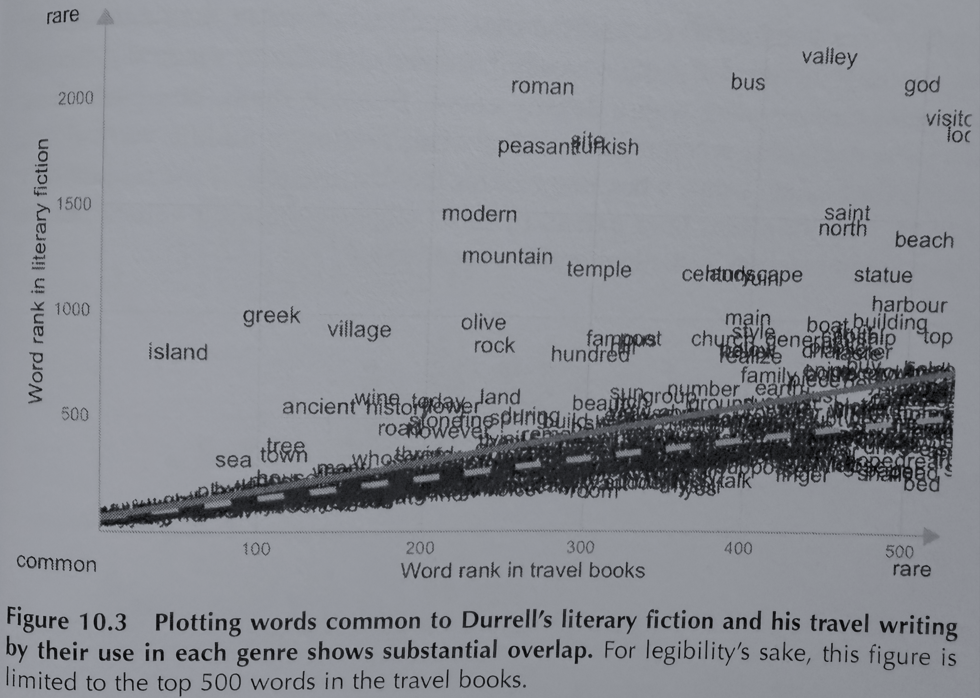 This figure [Figure 3] might seem to show evidence that Durrell’s travel books use rarified diction, surpassing even the literary works, but it actually shows the opposite. That the solid line rises more steeply demonstrates the travel books’ greater reliance on words common to both genres. Put another way, the literary works draw from a larger vocabulary, many words of which have been excluded here. Few words become legible by sinking below the tangle, and none that rise above it is surprising, considering that this latter group shows words used more often in books introducing islands that are Greek, featuring villages in valleys between mountains.