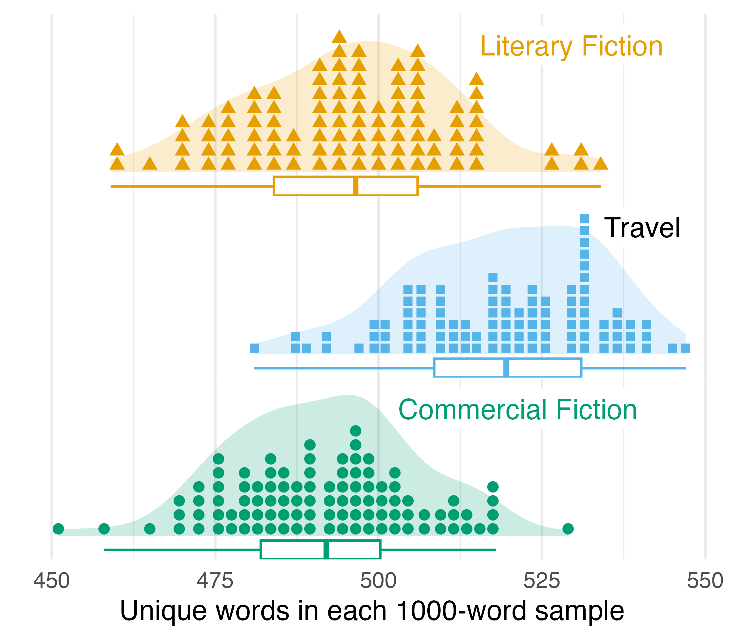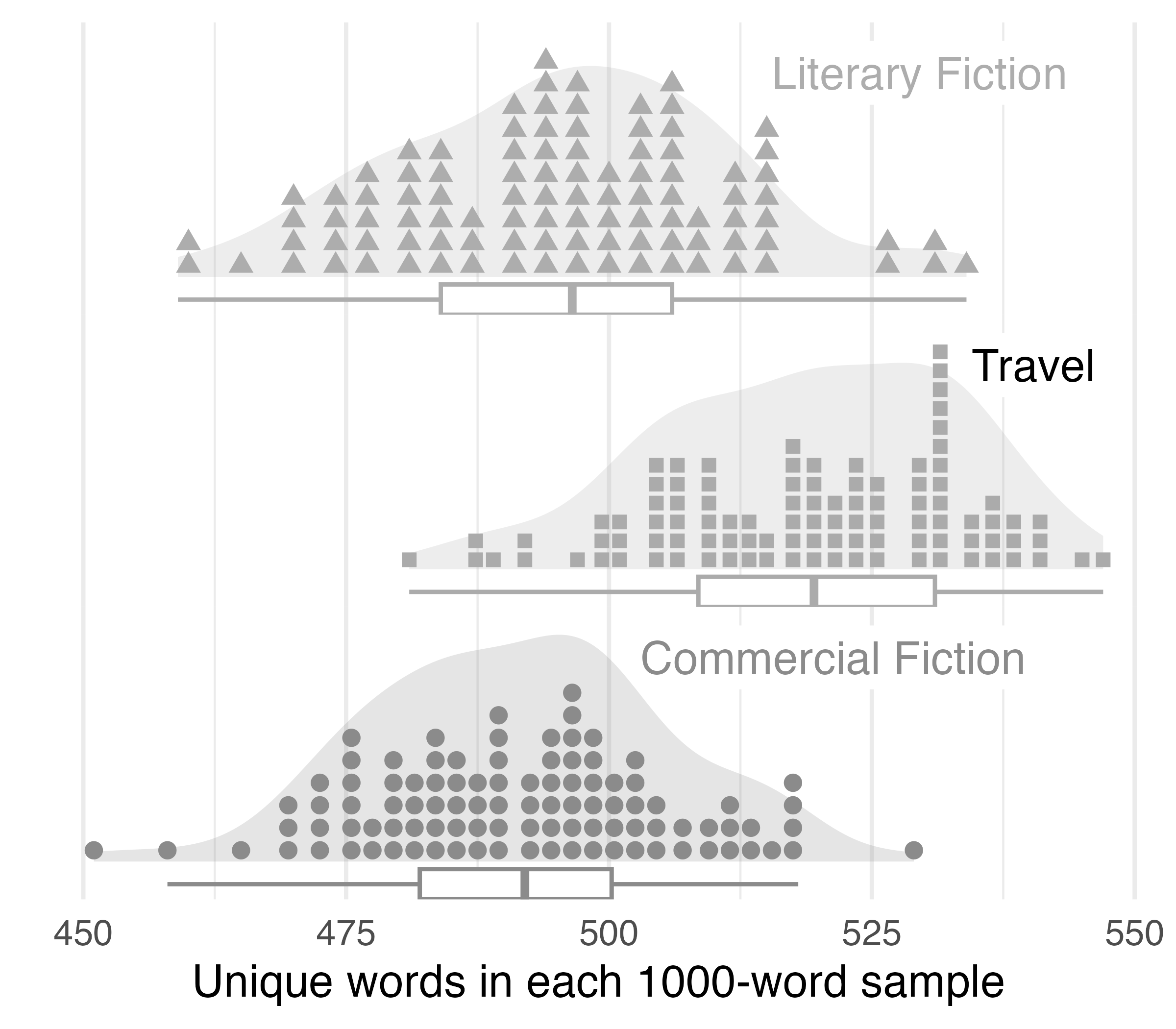 While this figure compares the words that are common among Durrell’s literary novels and his travel books, it does so by comparing differently sized genres. Six travel books are set against twelve literary novels. A better, balanced approach would approximate a reader’s experience, looking at smaller portions of text and comparing them to equally-sized sections from each genre. Figure 4 follows this approach. Each dot in this chart represents a single sample of 1,000 words taken randomly from a genre. The number of unique words in the sample is counted, and the dot gets placed horizontally based on this number. For each genre, the process is repeated 100 times, and the dots stack when more than one sample has the same number of unique words. Behind the dots, a shadow indicates a similar measurement with a density curve. Beneath them, box plots show the same data using a common statistical visualization: a middle vertical line shows the median value, a box emphasizes the distribution of the middle 50 values, and horizontal lines extend to show where remaining values fall; in this implementation, statistical outliers are ignored.