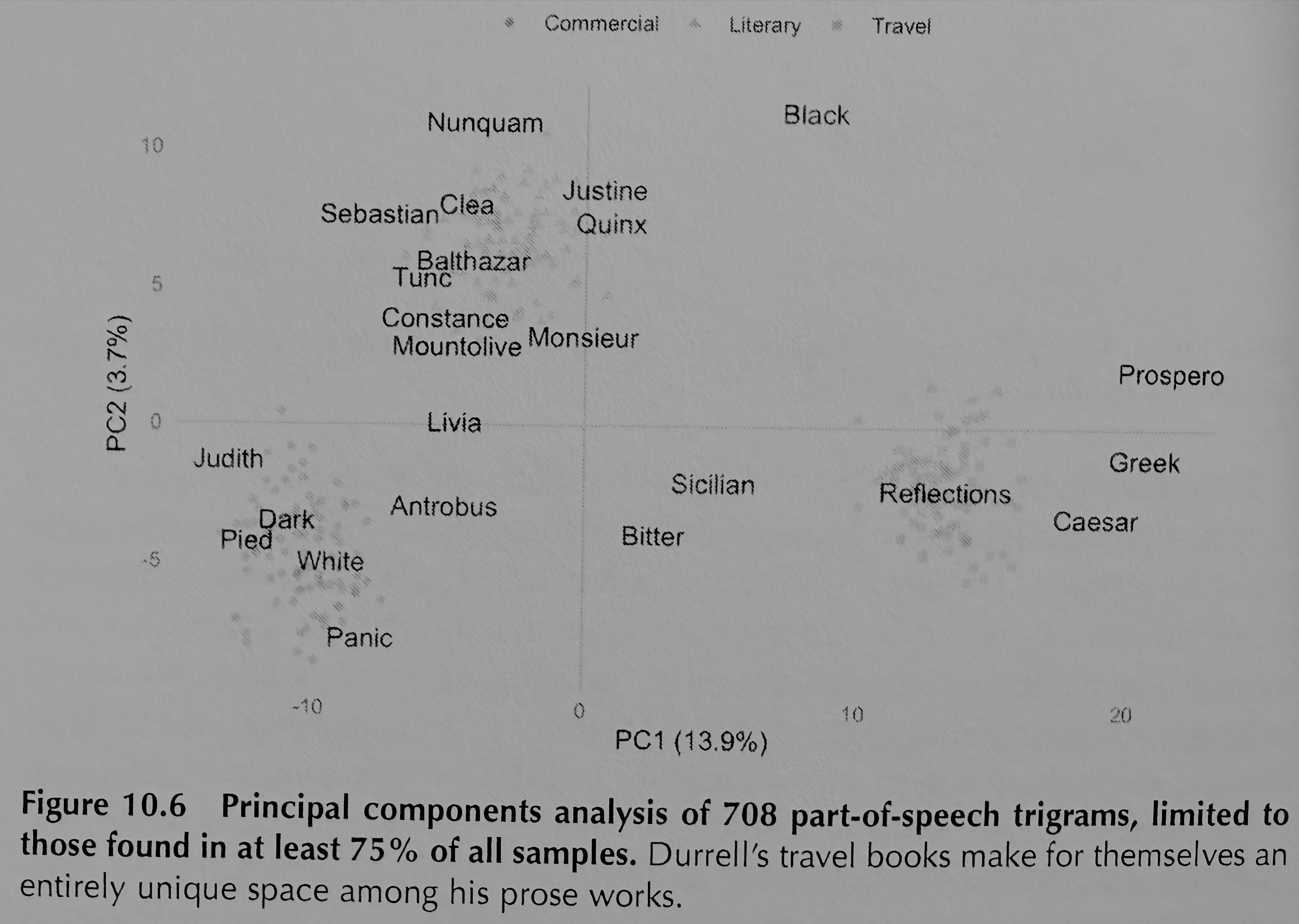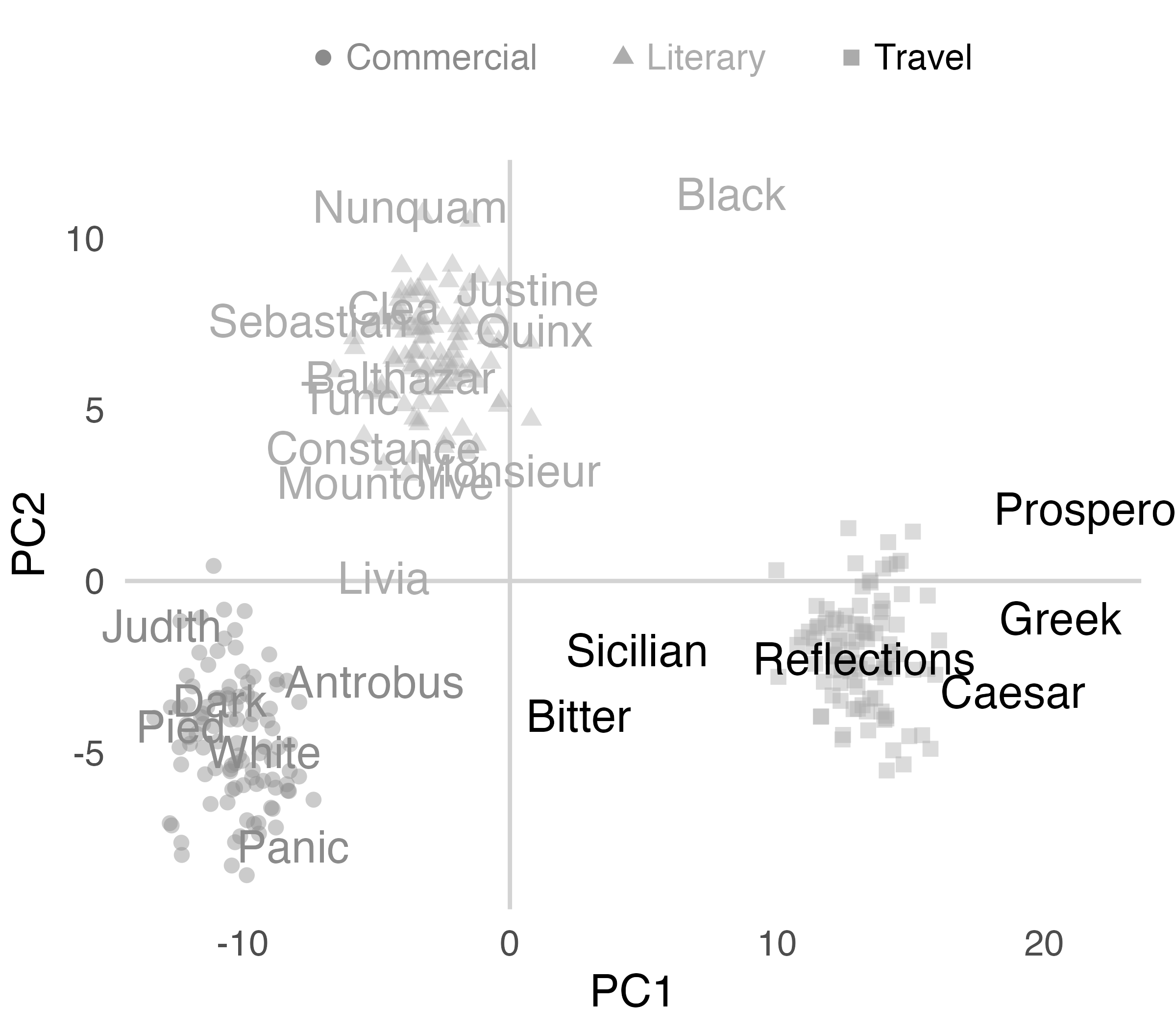 Skipping ahead, Figure 6 most strongly refutes the suggestion that Durrell’s travel books—written with great concern for financial stability but appreciated for their literary qualities—might fall stylistically somewhere between the other two prose genres. It shows how part-of-speech trigrams distinguish the works, with prose works separating most strongly by fiction and nonfiction. While the texts have more than 700 trigram patterns, I used principal components analysis to reduce them to two dimensions. The chart was created by sampling each genre, measuring grammatical patterns, and plotting them in this reduced space. Whole texts were then projected into the same space using patterns learned from the samples (by multiplying whole-text frequencies by the eigenvectors of the sample-based analysis).